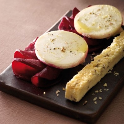 Arrangez joliment les tranches de betterave avec le fromage de chèvre dessus.